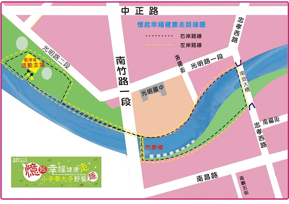 健走路線與場地配置 健走路線:約計1.5公里,分南崁溪左/右岸二條路線,環繞光明河濱公園及第一河濱公園 場地圖: